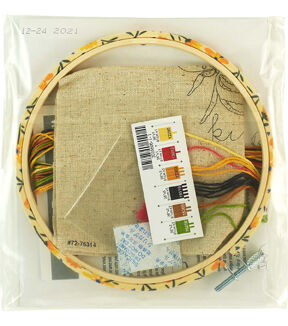 - Contains presorted thread, printed fabric, die-cut felt, 6-inch fabric-covered hoop, needle, and instructions