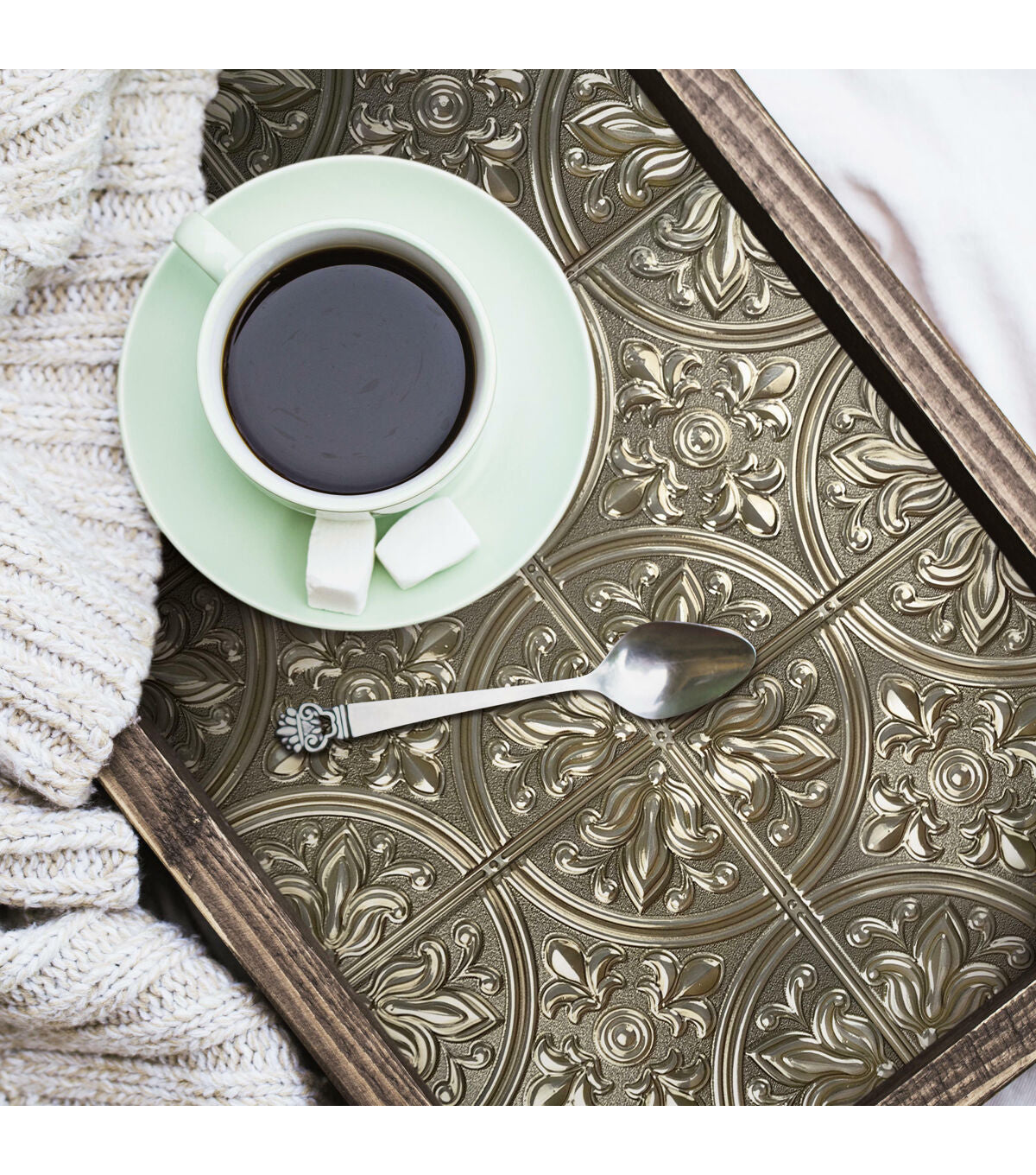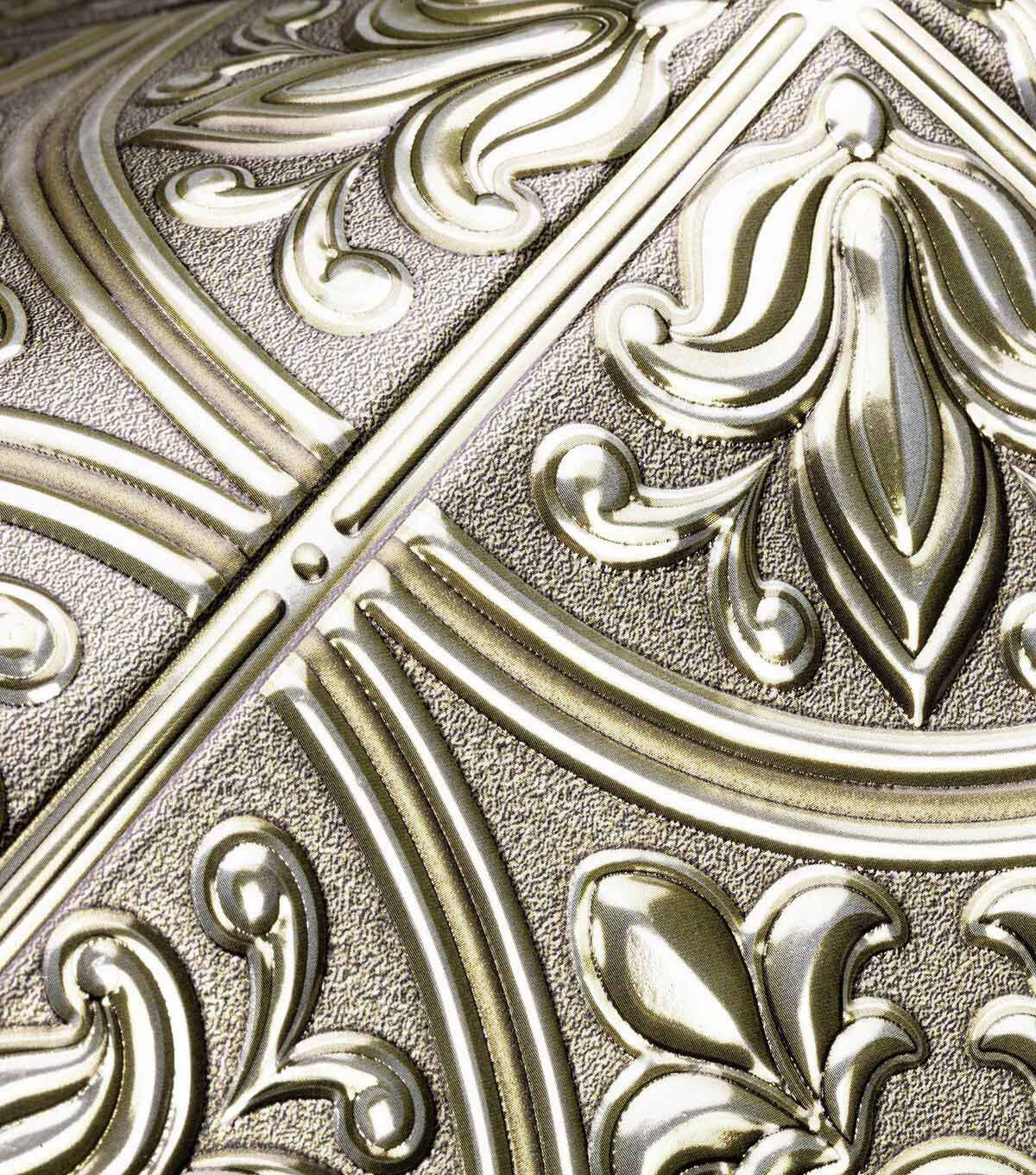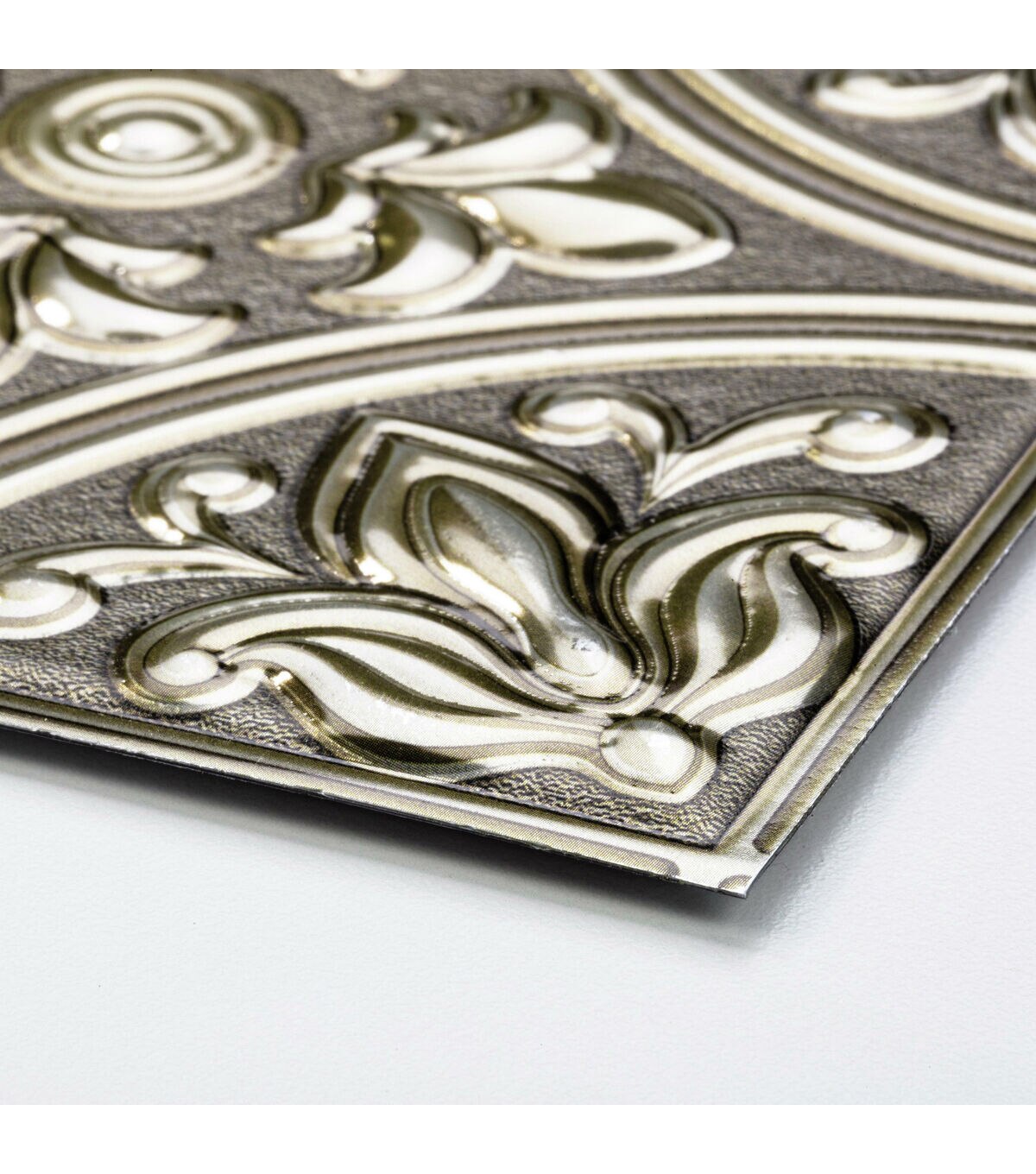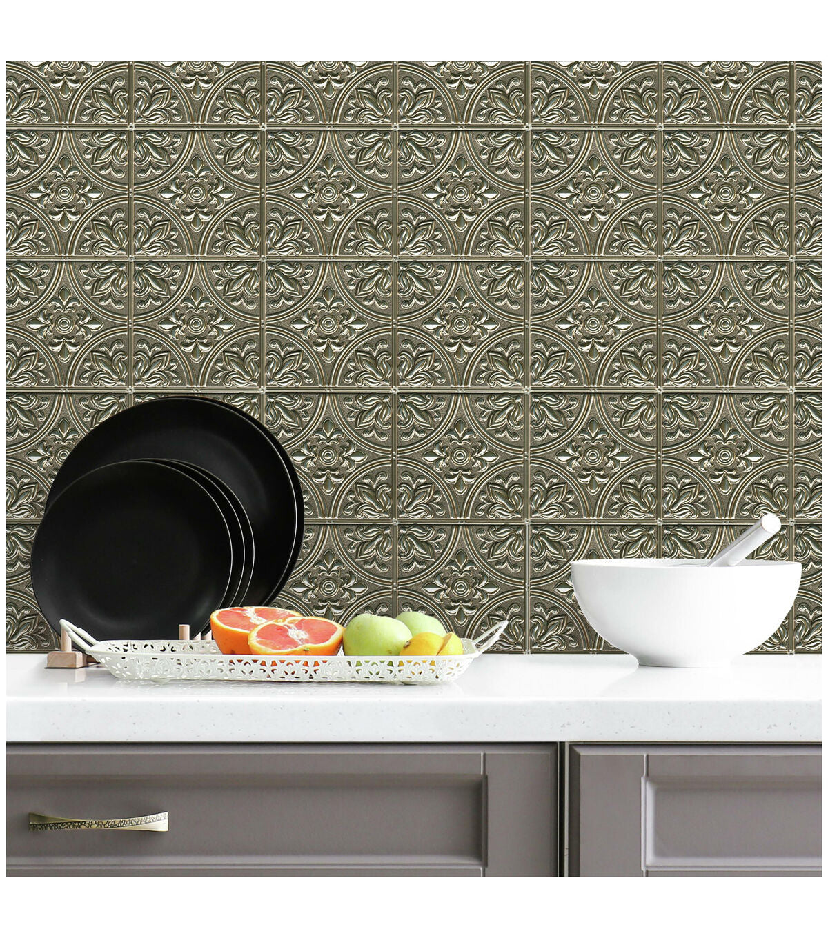The classic beauty of Victorian tin tiles is interpreted into easy and affordable current design with these Gold Tin Peel and Stick StickTiles from RoomMates. Designed to imitate the exquisite ceiling plasterwork of grand European homes, faux pressed tin designs are now fashionably used for art-work, back splashes, cabinet faces, wainscoting and more. The 3D/embossed design elements within the tile capture timeless motifs like the fleur de lis, acanthus scrolls, medallions and architectural gridwork. Burnished metal finish with a wash of soft gold make these StickTiles the perfect accompaniment to any home décor with metal accents. RoomMates StickTiles are easy to clean and are the go-to solution for do-it-yourself easy and affordable décor installed with regular household tools, helping you decorate in minutes. Just peel and stick! 4 Tiles 10.5 inch x 10.5 inch 3.07 sq. ft.
