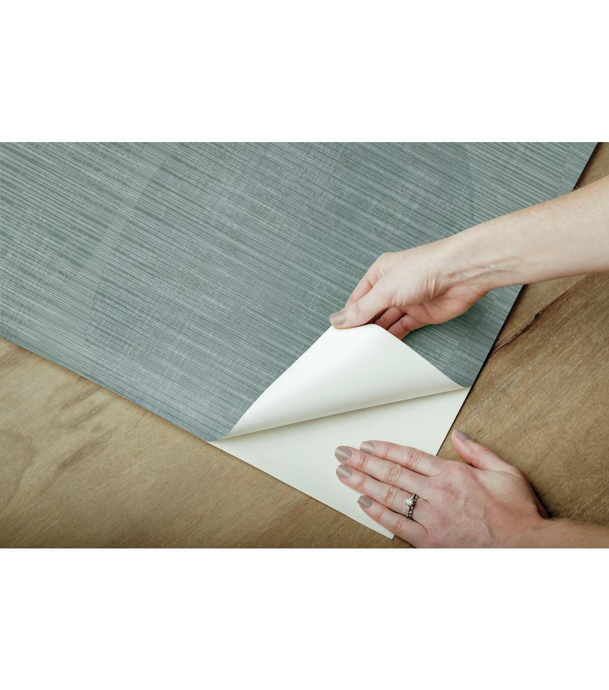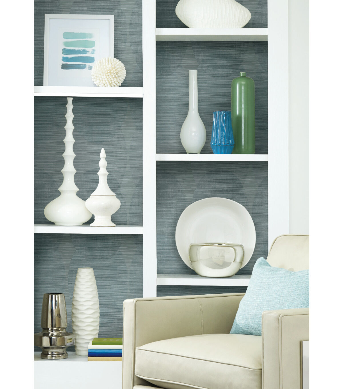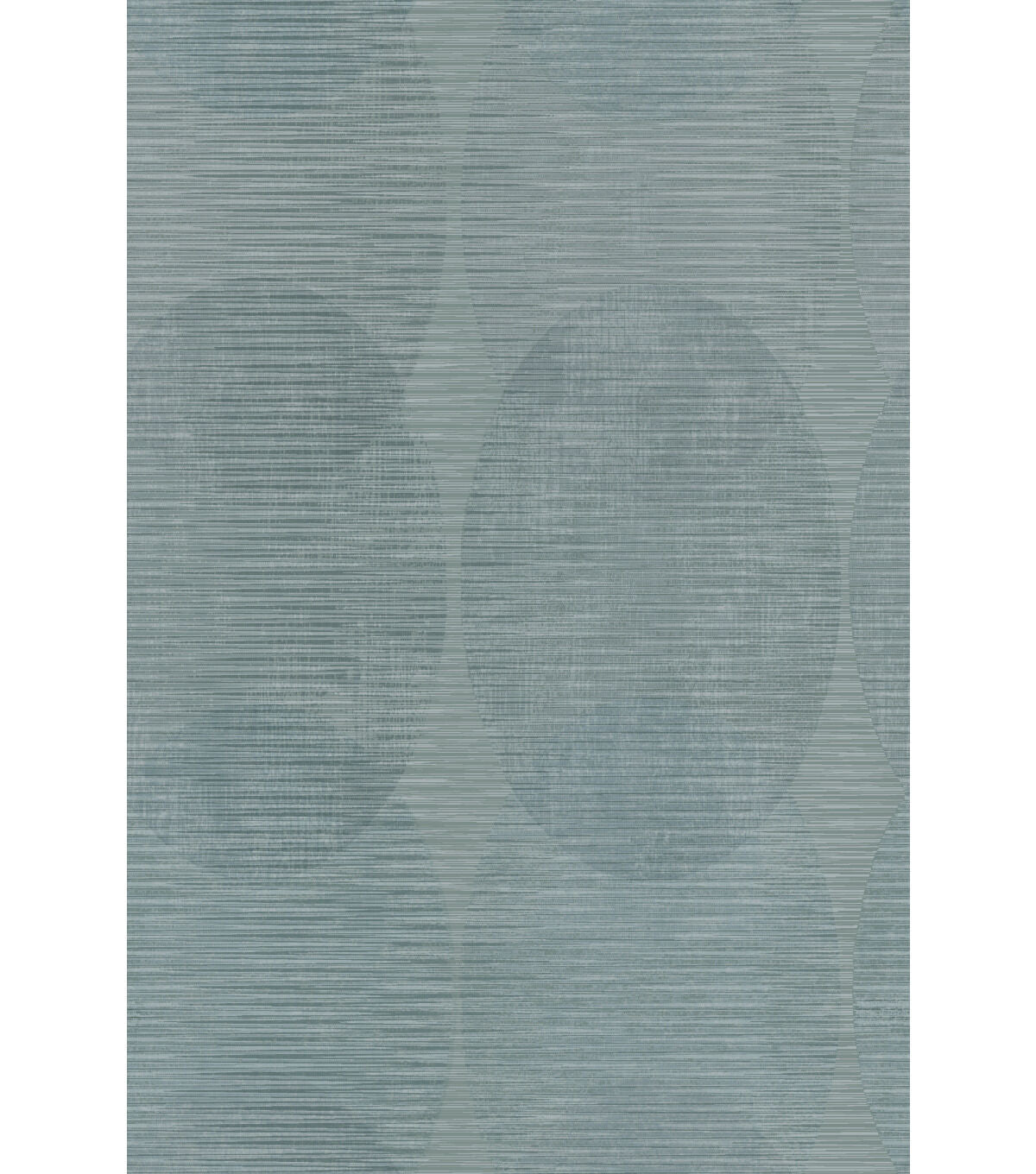 Subtle overlapping ellipticals chain together in vertical links and softly mottled horizontal striations create a contemporary fashion statement in Sahara peel and stick wallpaper by Nikki Chu for RoomMates.