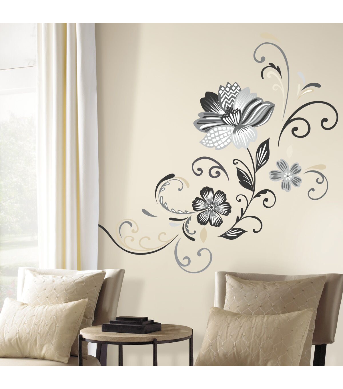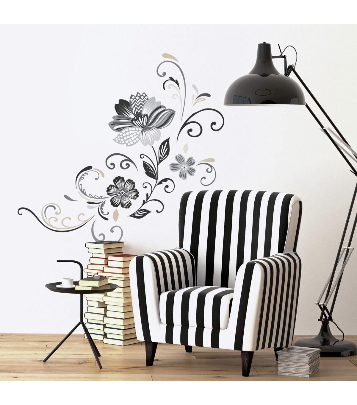 Create a space with elegance and class with these Black and White Flower Scroll peel and stick wall decals. Designed with gold, grey and black art, these wall decals complement any color furniture. Easy to apply, remove and reposition as much as necessary without damaging the wall decal. Hang in a living room, bedroom, bathroom and more!